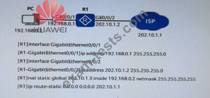 As shown in the figure, a static NAT command is deployed on router R1. When the PC accesses the Internet, the destination address in the data packet will not change.