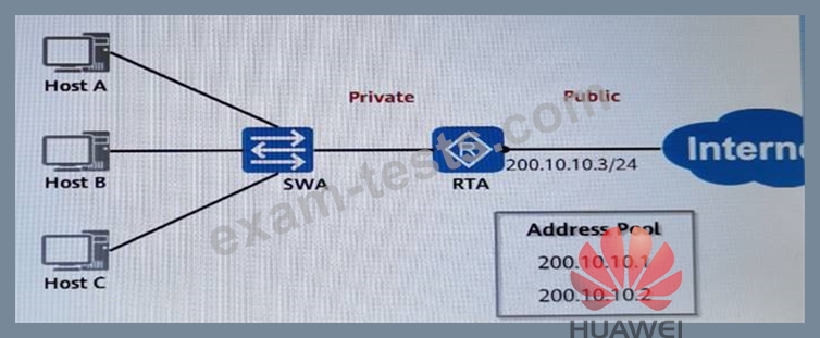 As shown in the figure, RTA uses NAT technology and realizes multiple-to-multiple NAPT address translation by defining an address pool, so that hosts in the private network can access the public network. Suppose that there are only two public IP addresses in the address pool, and they have been assigned to hosts A and B for address conversion, and if host C also wants to access the public network, which of the following description is correct?