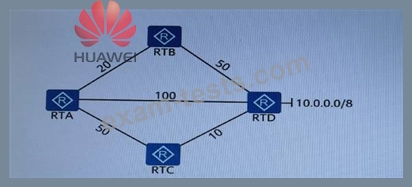 In the network shown in the figure below, all routers run OSPF protocol. Above the link is the value of the Cost value, then the path for RTA to reach the network 10.0.0.0/8 is: