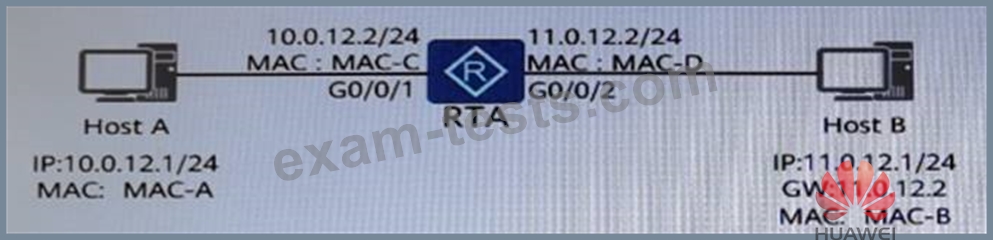 In the network shown in the figure below, host A is not configured with a gateway, and host B has the ARP cache of the gateway. Use the command ping 11.0.12.1 on host A.