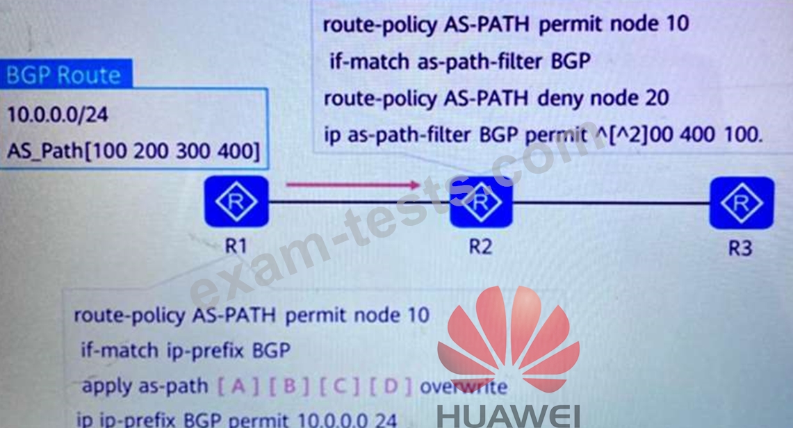 The configuration shown in the figure is performed on R2 to filter all received routes. Assuming that there is a BGP route with the AS_Path attribute of [100 200 300 400] on R1 that needs to be sent to R2, please help the network administrator to adjust the order of AS in the AS_Path attribute of the route on R1 to ensure that the routing entries will not be filtered by the routing policy of R2. (Sorting questions)