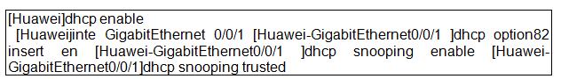 [Huaweijinte GigabitEthernet 0/0/1 [Huawei-GigabitEthernet0/0/1 ]dhcp option82 insert en [Huawei-GigabitEthernet0/0/1 ]dhcp snooping enable [Huawei-GigabitEthernet0/0/1]dhcp snooping trusted