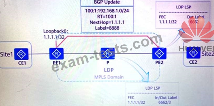 As shown in the figure, Site1 and Site2 need to achieve mutual access through the operator's BGP/MPLS IPVPN. It is known that the public network tunnel between PE1 and PE2 has been established (the label information is shown in the figure), and PF1 has advertised the 192.168.1.0/24 network segment route in Site1 to PE2 through the MP.JIBGP neighbor relationship, and the route learning is normal.