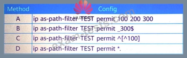 Network administrator A wants to use AS-Path Fiter to match routing entries with the BGP routing attribute AS_PATH [100 200 300]. Network administrator A sorts out the four configurations in the figure. Which of the following configurations can satisfy the network administrator A's requirement? (Multiple choice)