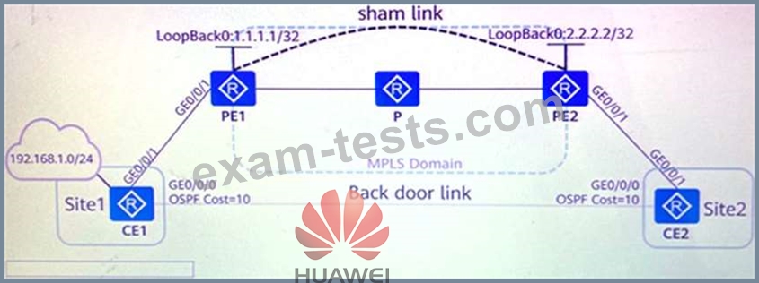As shown in the figure, a sham link is established between PE1 and PE2 through the LoopBackD interface. CE2 can learn the route to the 192.168.1.0/24 network segment (the direct route on CE1) through the sham link and backdoor link. If you keep the default configuration, the cost value of the route from CE2 to the 192.168.1.0/24 network segment should be (). (Please fill in the Arabic numerals directly, without symbols)