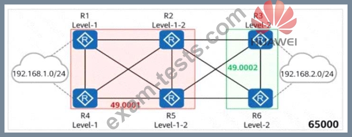 On the network shown in the figure, IS-IS runs on Rl, R2, R4, and R5, and the area ID is 49.0001. IS-IS runs on R3 and R6, and the area ID is 49.0002. In AS 65000, Ri, R3, R4, and R6 each establish IBGP peer relationships with R2 and R5. R2 and R5 are RRs, and Rl, R4, R3, and R6 are clients. The IBGP peer relationships are established using LoopbackO. The IP address of LoopbackO on each router is 10.0.X.X/32, and the router ID is 10.0.X.X, where X is the number of the router. Rl and R4 import the external route