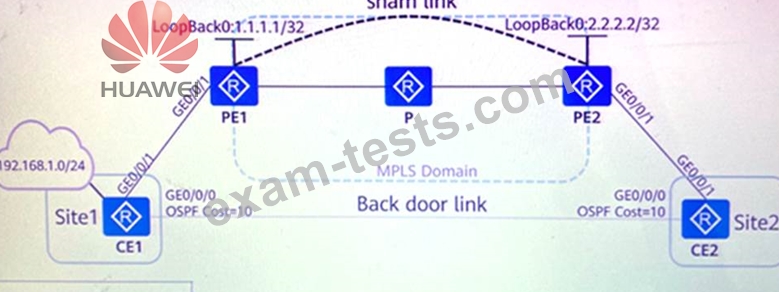 As shown in the figure, a sham link is established between PE1 and PE2 through the LoopBackD interface. CE2 can learn the route to the 192.168.1.0/24 network segment (the direct route on CE1) through the sham link and backdoor link. If you keep the default configuration, the cost value of the route from CE2 to the 192.168.1.0/24 network segment should be (). (Please fill in the Arabic numerals directly, without symbols)