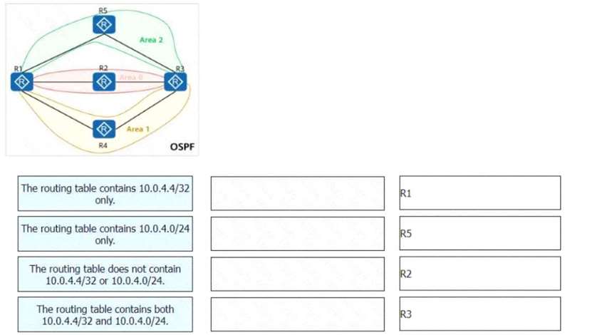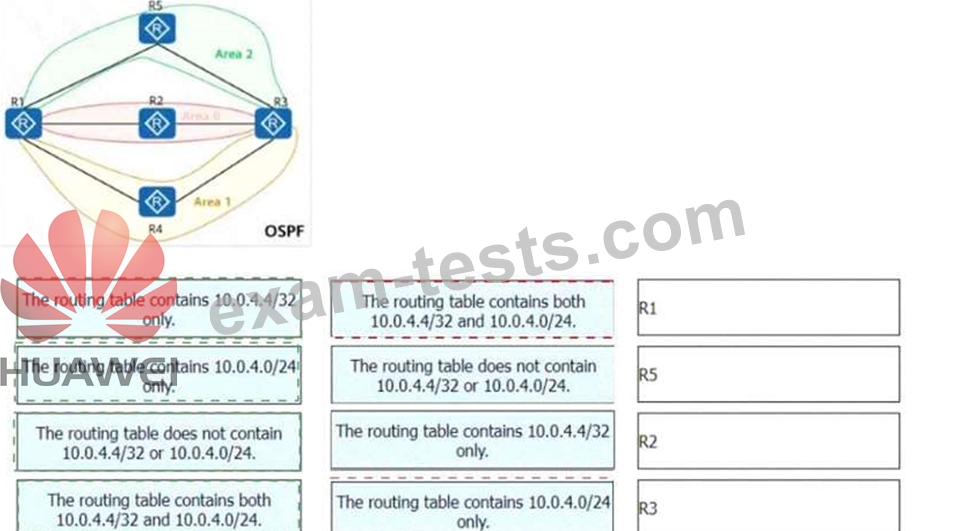 On the OSPF network shown in the figure, area 1 is an NSSA, area 2 is a stub area, and R4 imports an external route 10.0.4.4/32. The router ID of each router is 10.0.X.X, where X is the router number. The asbr-summary 10.0.4.0 255.255.255.0 command is configured in the OSPF processes of R1 and R3.