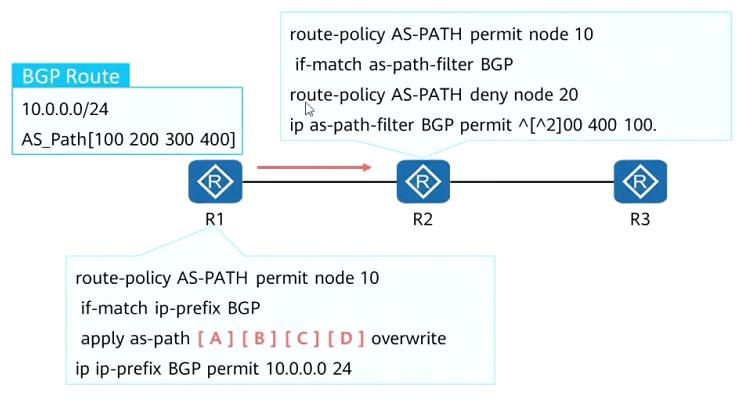 The configuration shown is performed on R2 to filter all incoming routes. Suppose there is a BGP route with the AS_Path attribute of [100200300400] on R1 that needs to be sent to R2. Please help the network administrator to adjust the AS order in the AS_Path attribute of the route on R1 to ensure that the route entry will not be filtered by the routing policy of R2____, ____, ____, ____.