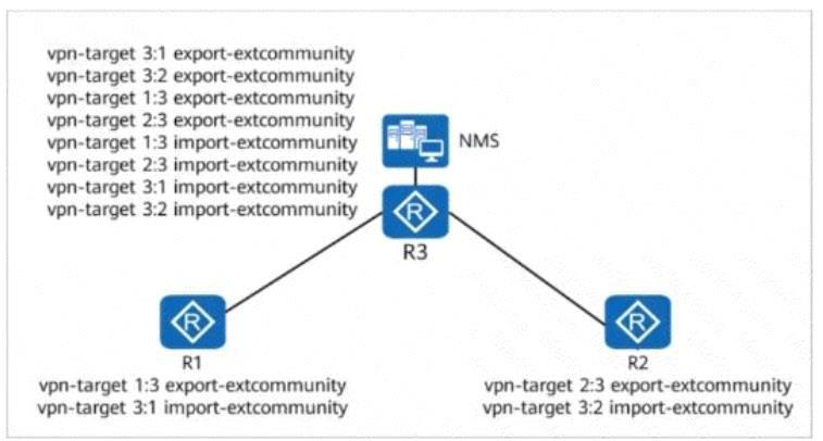 On the enterprise network shown in the figure, R3 is connected to the NMS, and all devices on the network communicate with the NMS through a VPN. During an inspection, it is found that R3 has redundant RTs (Route Targets). Which of the following commands can be run on R3 to delete the redundant RTs without affecting the connectivity between all devices and the NMS? Options: