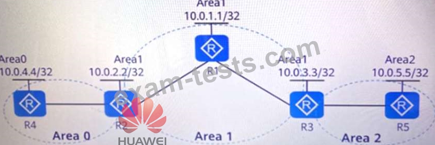 As shown in the figure, all interfaces of the router enable OSPF. The ip address identified in the figure is the IP address of the device's Loopback 0 port. R1, R2, R3EJLoopbacD are advertised in area 1, and Loopbacfk D of R4 is advertised in area D, the Loopback D of R5 is advertised in area 2. Which of the following addresses can ping each other?