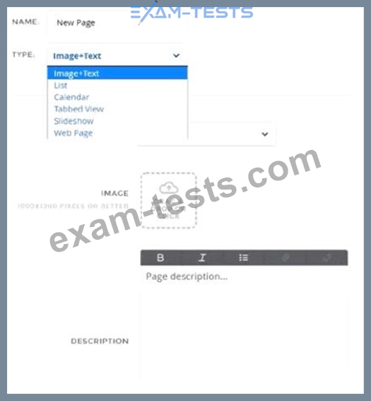 An app developer wants to create a new page to allow visitors to navigate to other list pages. Using the menu shown in the exhibit, which page type would be best for this purpose?