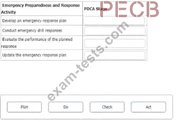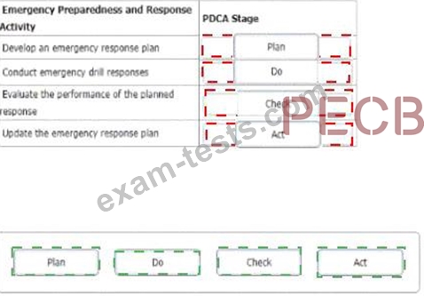 Consider the emergency preparedness and response process outlined in ISO 45001. Match each process activity to the correct stage of the PDCA cycle.