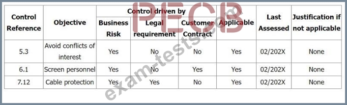 在第二階段審核期間,您的審核團隊發現沒有證據顯示實施了適用性聲明摘錄中顯示的三項控制措施(5.3 職責分離、6.1 篩選、7.12 佈線安全)。未找到風險處理方案。