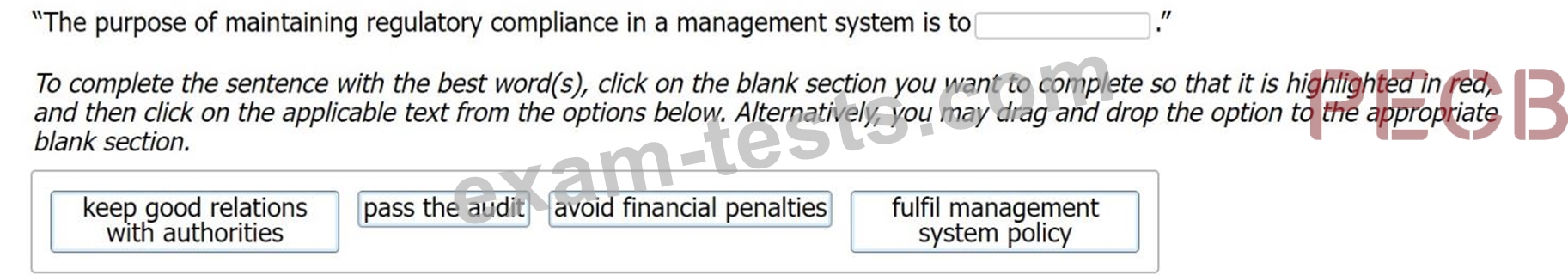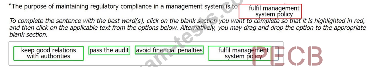 「在管理系統中維護法規遵從性的目的是要用最好的單字完成句子,請點擊要完成的空白部分,使其以紅色突出顯示,然後點擊來自的適用文字或者,您可以將選項拖放到對應的空白部分。