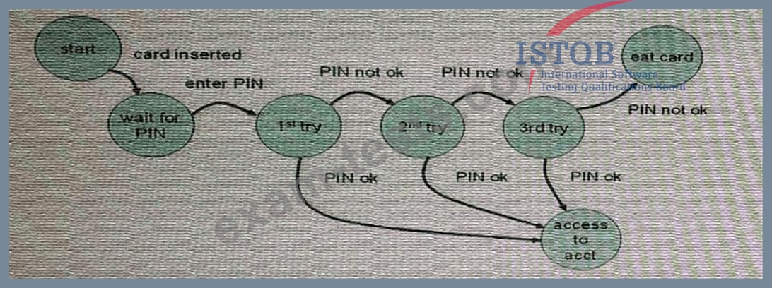 Based on the system state transition diagram of an ATM system shown below, using the state transition test technique which of the following is an example of a test case required to achieve 1-switch coverage?