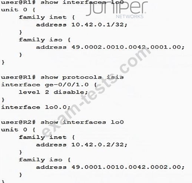 Referring to the exhibit, which configuration change is needed for an IS-IS Level 1 adjacency between R1 and R2?