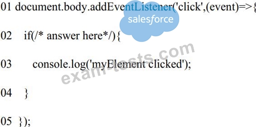 Which replacement for the conditional statement on line 02 allows a developer to correctly determine that a specific element, myElement on the page had been clicked?