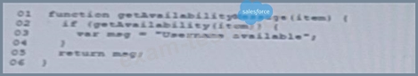 A developer writes this code to return a message to a user attempting to register a new username. If the username is available, a variable named msg is declared and assigned a value on line 03.