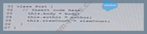 A developer creates a class that represents a blog post based on the requirements that a Post should have a body, author, and view count. The code is shown below: