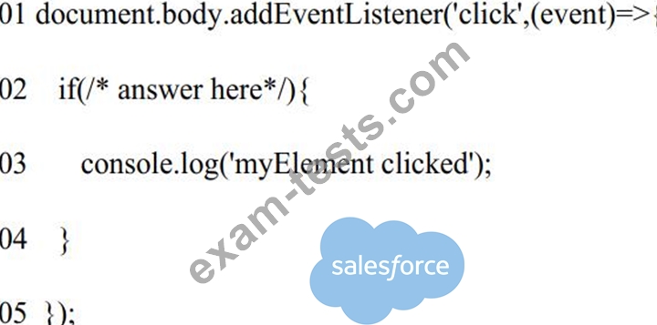 Which replacement for the conditional statement on line 02 allows a developer to correctly determine that a specific element, myElement on the page had been clicked?