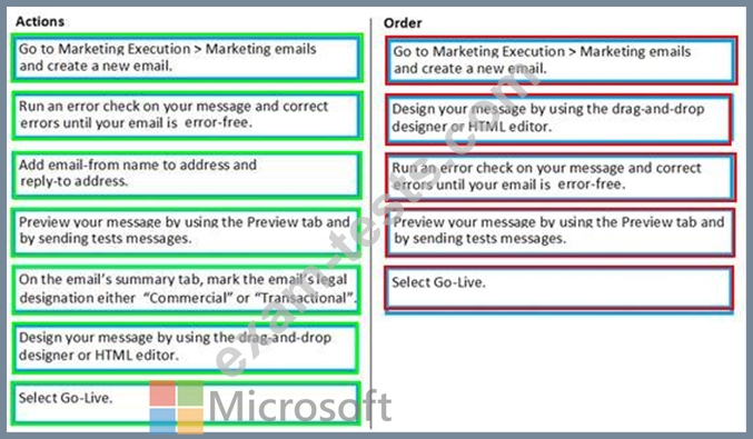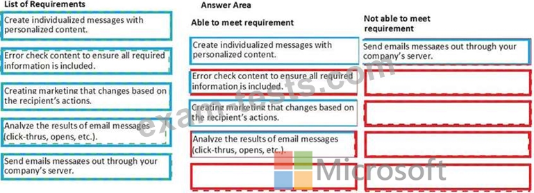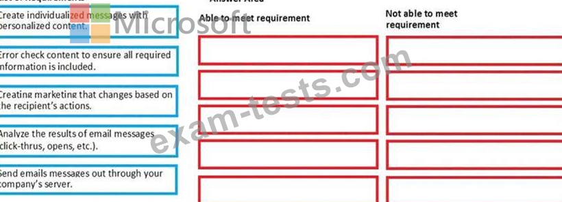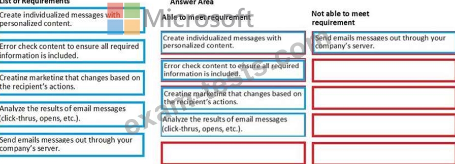 Which requirements will you be able to meet by utilizing the tools in Dynamics 365 for Marketing? To answer, drag the appropriate requirement to the correct column. Each requirement may be used once, more than once or not at all. You may need to drag the split bar between panes or scroll to view the content.