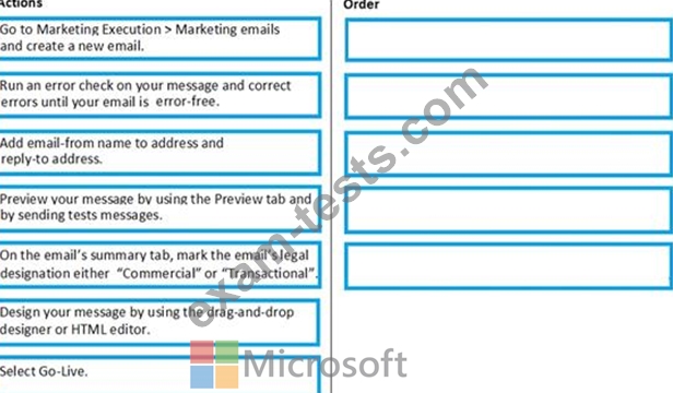 Which five actions in sequence are required to create an email that is ready to send? (Choose five.) To answer, move the appropriate actions from the list of actions to the answer area and arrange them in the correct order.