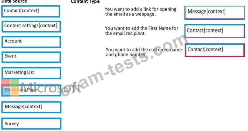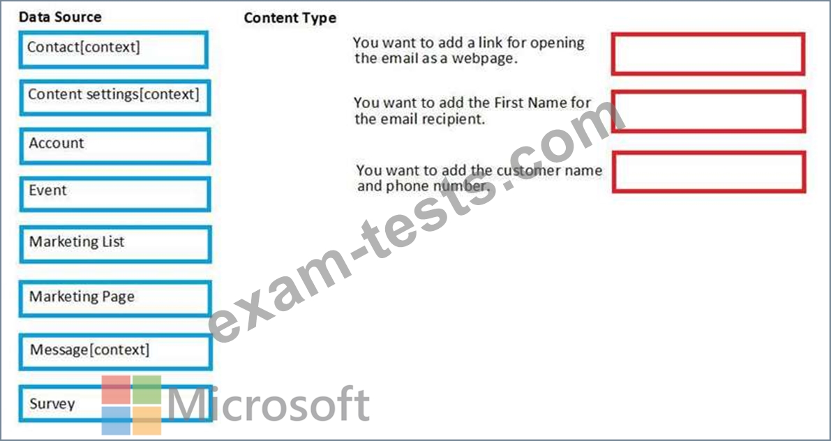 Which data source should you use to add the content types listed? To answer, drag the appropriate data source to the appropriate content type. Each data source may be used once, more than once and not at all.