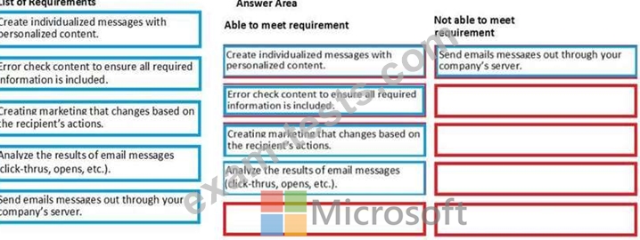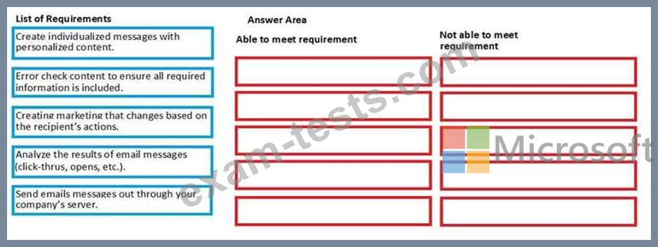 Which requirements will you be able to meet by utilizing the tools in Dynamics 365 for Marketing? To answer, drag the appropriate requirement to the correct column. Each requirement may be used once, more than once or not at all. You may need to drag the split bar between panes or scroll to view the content.