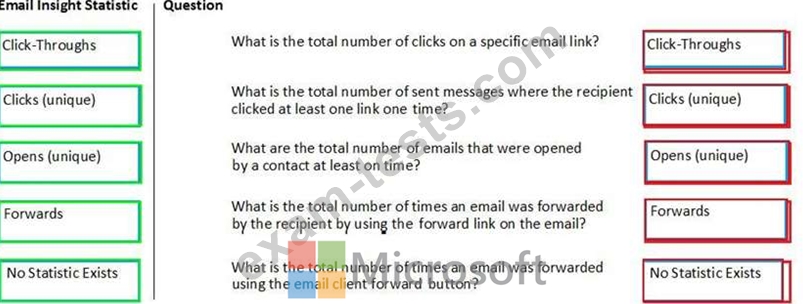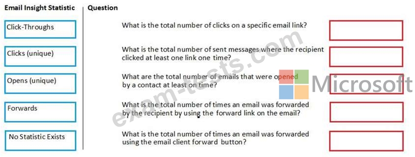 Which question is answered by the email insight statistic listed? To answer, drag the email statistic to the question answered by that statistic. Each statistic may be used one, more than once or not at all. You may need to drag the split bar between panes or scroll to view the content.