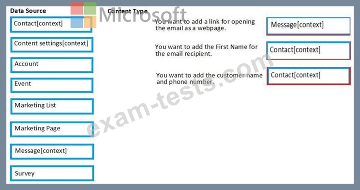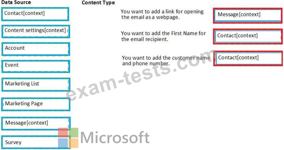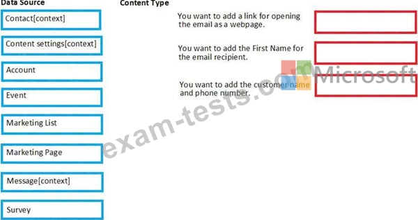 Which data source should you use to add the content types listed? To answer, drag the appropriate data source to the appropriate content type. Each data source may be used once, more than once and not at all. You may need to drag the split bar between panes or scroll to view the content.