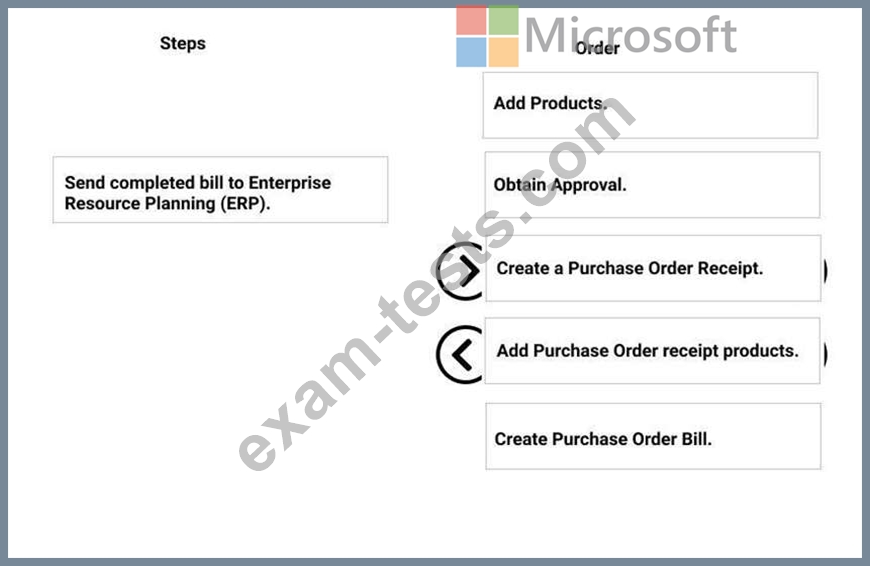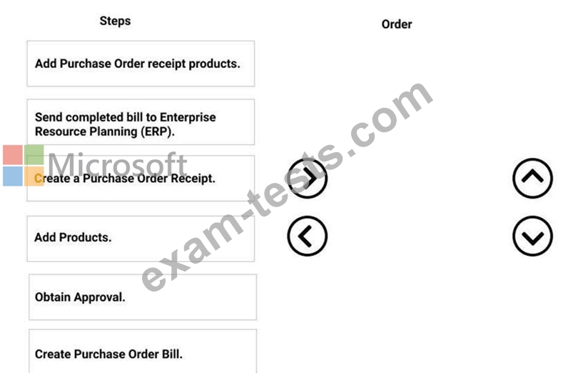 After creating a purchase order, what are the five steps, in sequence, for completing the order and receiving the products? To answer, move the appropriate actions from the list of actions to the answer area and arrange them in the correct order.