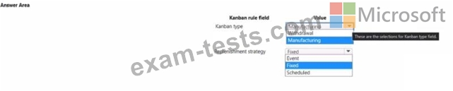 How should you set up the Kanban type and replenishment strategy? To answer select the appropriate options in the answer area.
