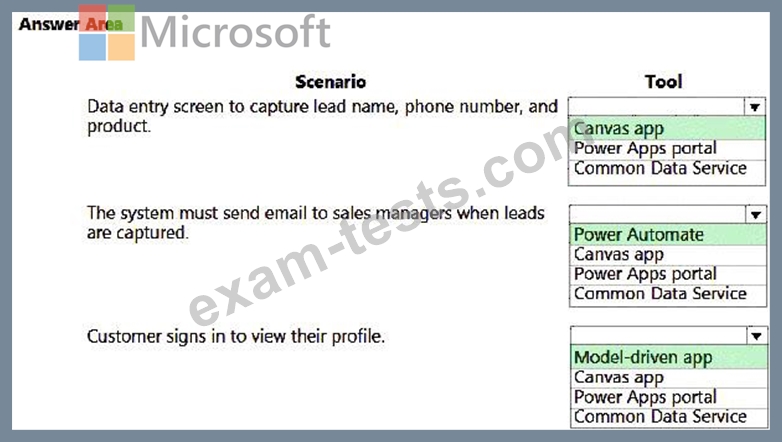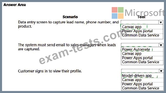 Which Power Apps tools should you use for each scenario? To answer, select the appropriate options in the answer area.