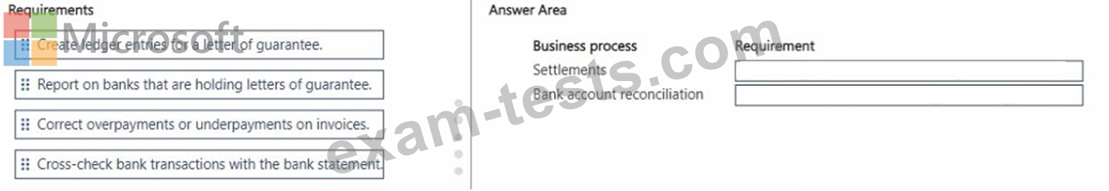Instructions: To answer, drag the appropriate requirement from the column on the left to its business process on the right Each requirement may be used once, more than once, or not at all. Each correct match is worth one point.