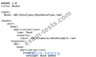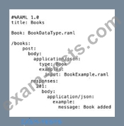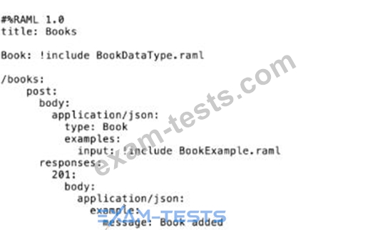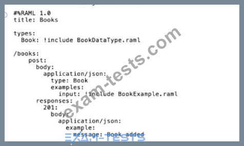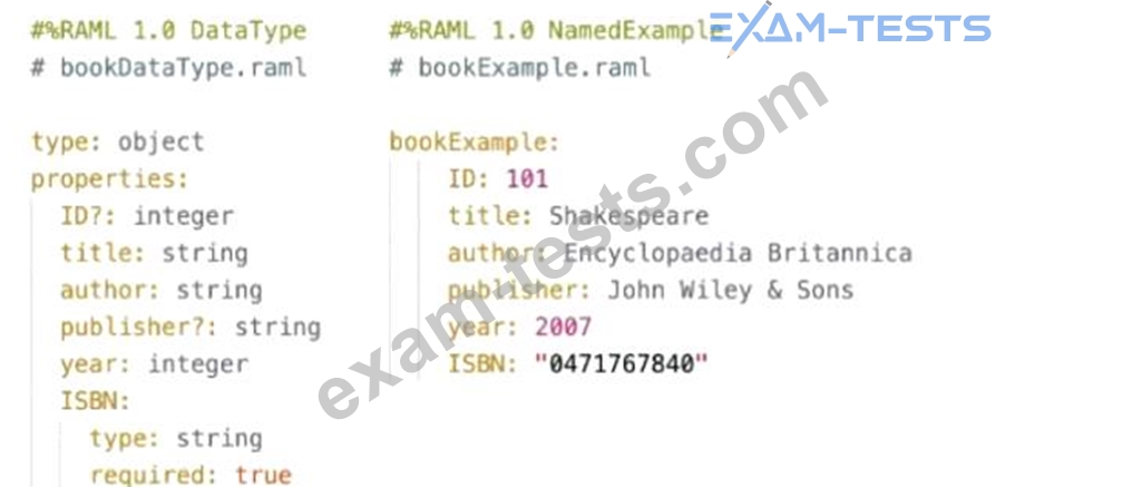 Refer to the exhibits. A company has defined this Book data type and Book example to be used in APIs. What is valid RAML for an API that uses this Book data type and Book example?