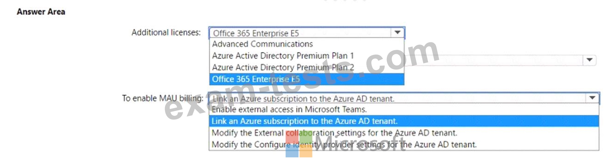 Which additional licenses should you assign, and what should you do to enable MAU billing? To answer, select the appropriate options in the answer area.