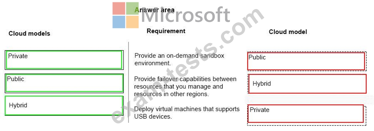 Which cloud models should you use? To answer, drag the appropriate cloud models to the correct requirements. Each cloud model may be used once, more than once, or not at all. You may need to drag the split bar between panes or scroll to view content.