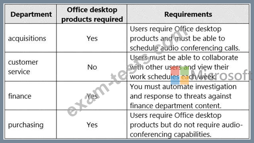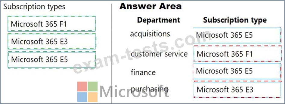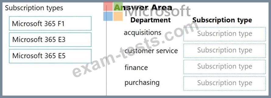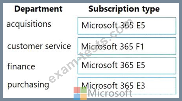 Which type of subscriptionshould you use for each department? To answer, drag the appropriate license types to the correct departments. Each license type may be used once, more than once, or not at all. You may need to drag the split bar between panes or scroll to view content.