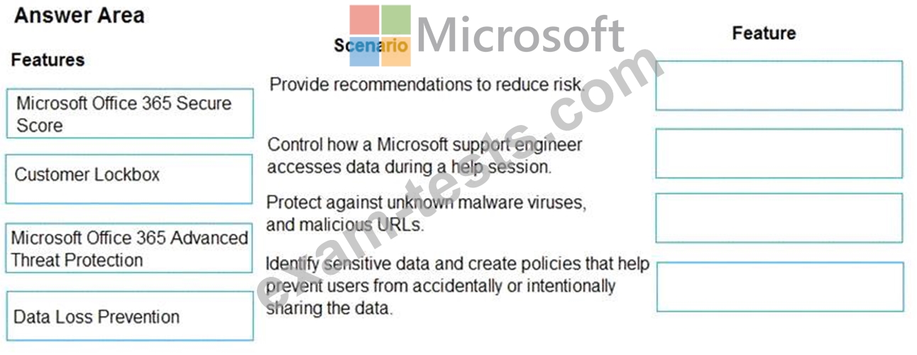 Which features should you implement? To answer, drag the appropriate features to the correct scenarios. Each feature may be used once, more than once, or not at all. You may need to drag the split bar between panes or scroll to view content.