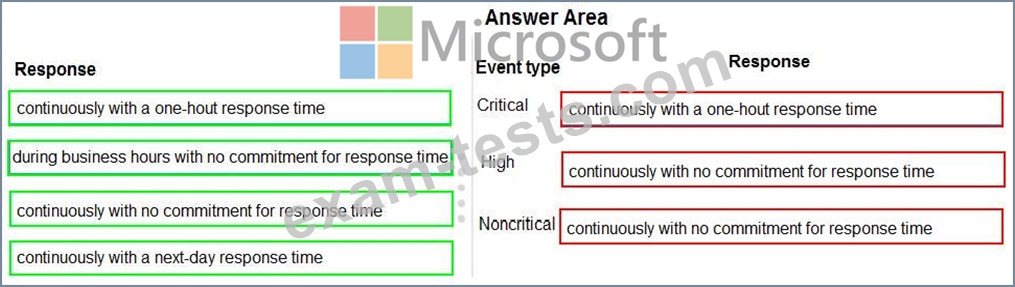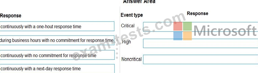 What response can you expect for each event type? To answer, drag the appropriate responses to the correct event types. Each response may be used once, more than once, or not at all. You may need to drag the split bar between panes or scroll to view content.