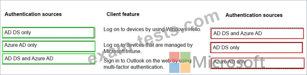 Match each feature to its authentication source. To answer, drag the appropriate authentication sources from the column on the left to the client features on the right. Each authentication source may be used once, more than once, or not at al.