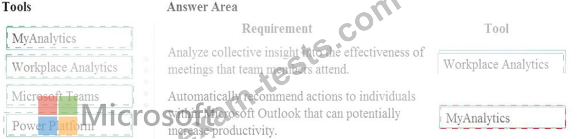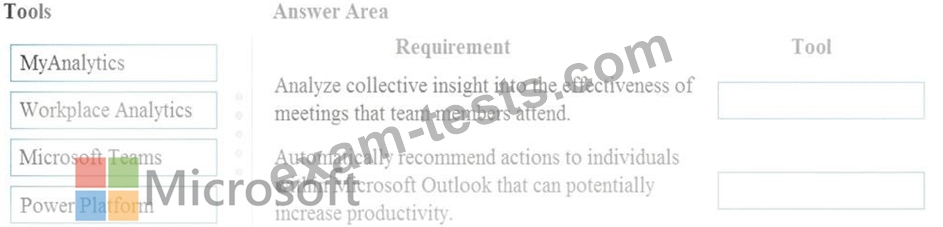 Which tool should you identify for each requirement? To answer, drag the appropriate tools to the correct requirements. Each tool may be used once, more than once, or not at all. You may need to drag the split bar between panes or scroll to view content.
