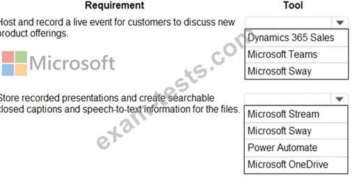 You need to select the Microsoft tool that the sales team should use for each requirement.