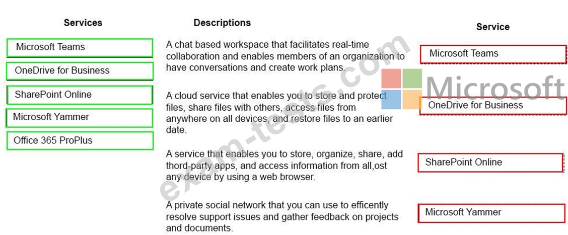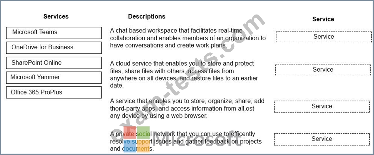 Match each Microsoft 365 service to the most appropriate service description. To answer, drag the appropriate services to the correct descriptions. Each service may be used once, more than once, or not at all. You may need to drag the split bar between panes or scroll to view content.