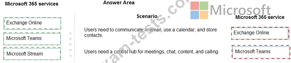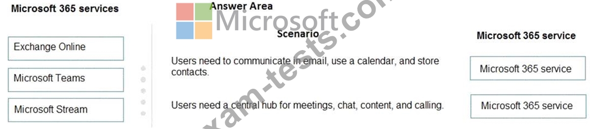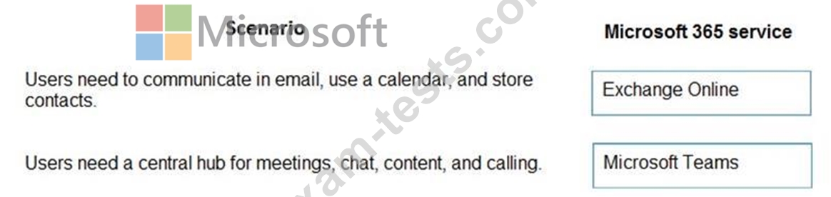 Match each scenario to its Microsoft 365 service. To answer, drag the appropriate Microsoft 365 service from the column on the left to its scenario on the right. Each Microsoft 365 service may be used once, more than once, or not at all.