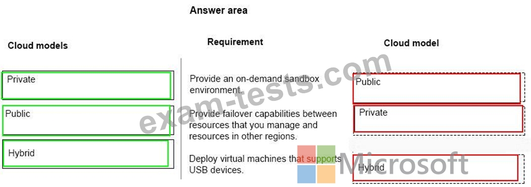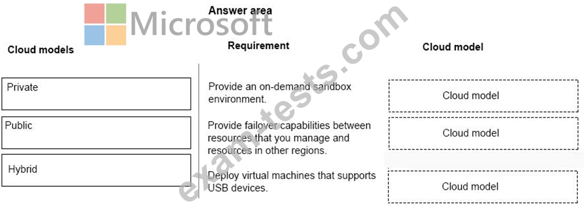 Which cloud models should you use? To answer, drag the appropriate cloud models to the correct requirements. Each cloud model may be used once, more than once, or not at all. You may need to drag the split bar between panes or scroll to view content.