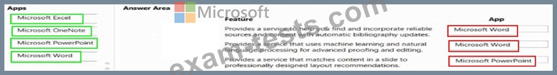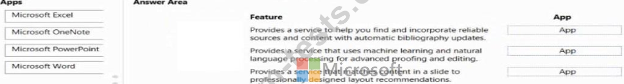Which Microsoft 365 Apps apps should you use? To answer, drag. the appropriate apps to the correct features. Each app may be used once, more than once, or not at all. You may need to drag the split bar between panes or scroll to view content.