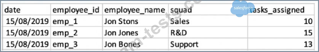 When filtering on the entire date range (1-30/8), and querying employee ID, Name and Squad with the two measurements - what will the result look like?