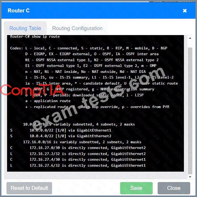 Install Static Route to 10.0.0.0/22 via 172.16.27.1 (assuming Router C's IP is 172.16.27.1):